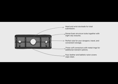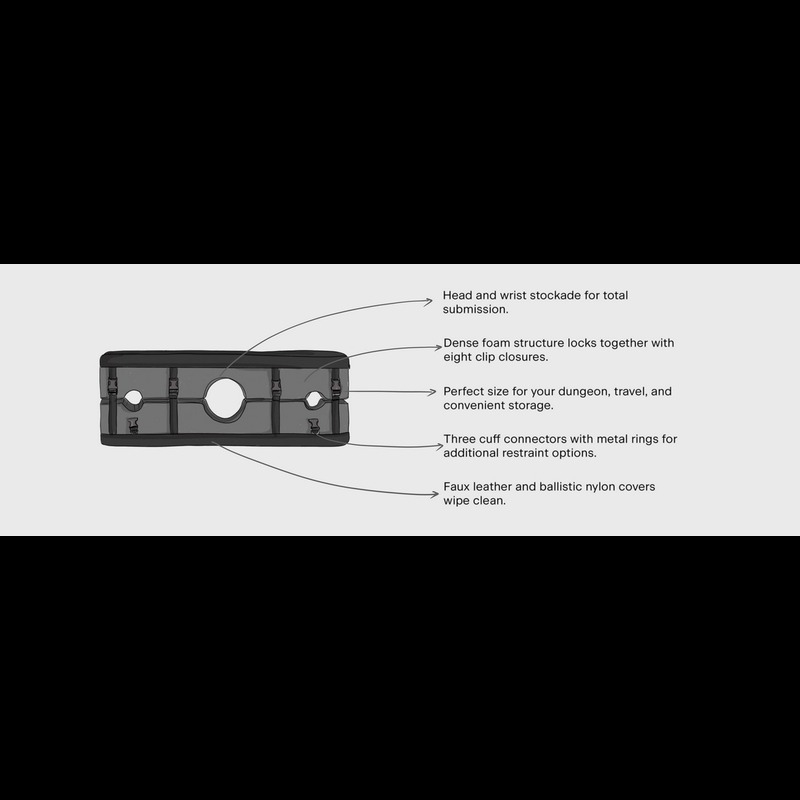 Get Locked Up…or Down. The Bastion Bondage Stock locks up your lover’s neck and wrists with eight clip closures and three cuff connectors with metal rings (in case you want to restrain ankles or use rope). Dense foam covered in faux leather and ballistic nylon ensures your sub’s comfort. The convenient size fits anywhere…under the bed, in a trunk, or in your personal sex dungeon. Let the Bastion Bondage Stock redefine discipline and domination.