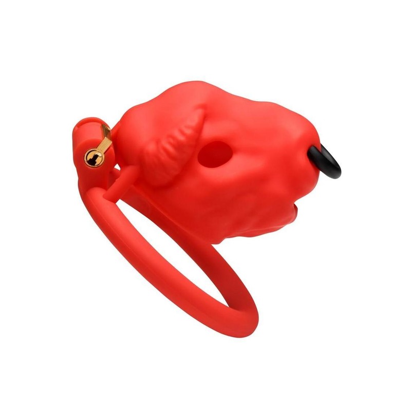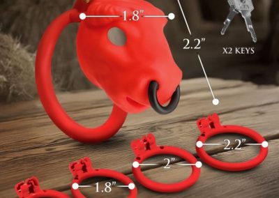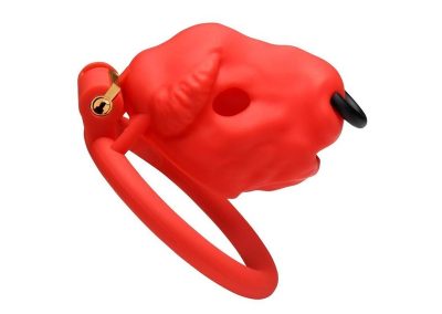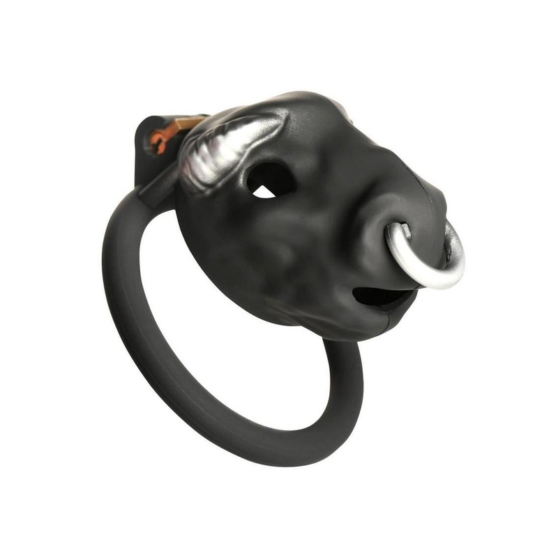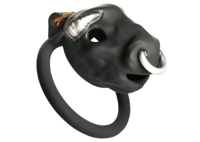 • Bull Themed Cage: Cage your raging bull by using this chastity cage! The bull head goes over the tip of the shaft, pressing it into place.